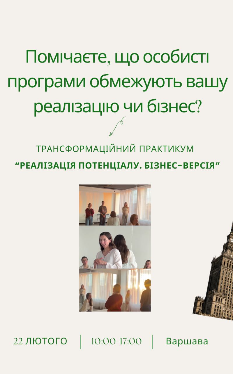 Вітаю на ще одному практикумі у Варшаві! Довгоочікувана тема по роботі з підсвідомими стратегіями, які безпосередньо впливають на ваш бізнес та діяльність. Ця зустріч об’єднує особистий та діловий контекст, як бонус - зміни буду більш помітні на матерії. Цей практикум для тих, хто хоче: - побачити що в підсвідомому стримує реалізацію власного потенціалу; - вийти з неефективних динамік або послабити їх вплив у темі реалізації та побудові своєї власної системи; - дослідити свої стосунки з клієн...