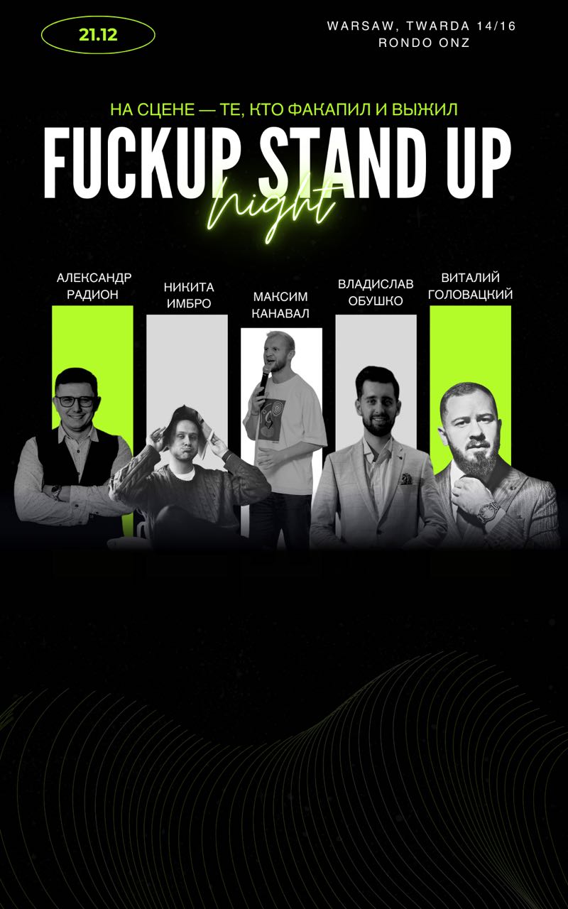 FuckUp Stand Up Night — вечер, где факапы предпринимателей превращаются в смех и опыт. Ошибки — часть пути. Когда делишься ими открыто — они вдохновляют. На сцене — 4 предпринимателя, которые ошибались, падали, поднимались и пошли дальше. Без глянца и пафоса — только честные истории и самоирония. 💬 Что ждёт: • 4 спикера и их бизнес-провалы • Q&A и мини-панель • Ведущий — Максим Коновал (комик шоу «Свидания вслепую») 💣 Кто выступает: Владелец Culture Cafe ☕️ Никита Имбро расскажет как П...