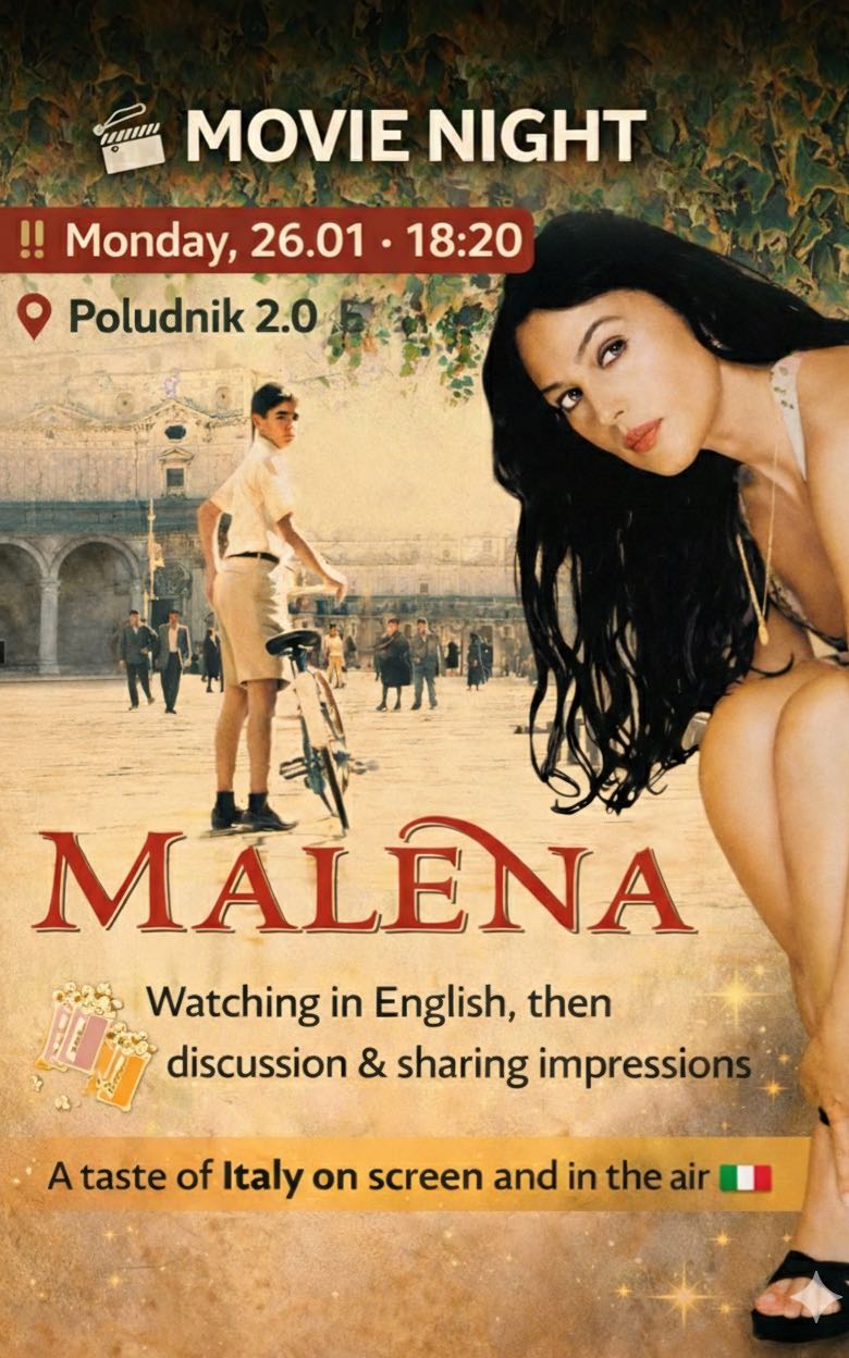🎬 Movie Night: Malena ‼️Monday, 26.01 · 18:20 📍Poludnik 2.0 🍩15zl Watching in English, then discussion & sharing impressions ☕✨